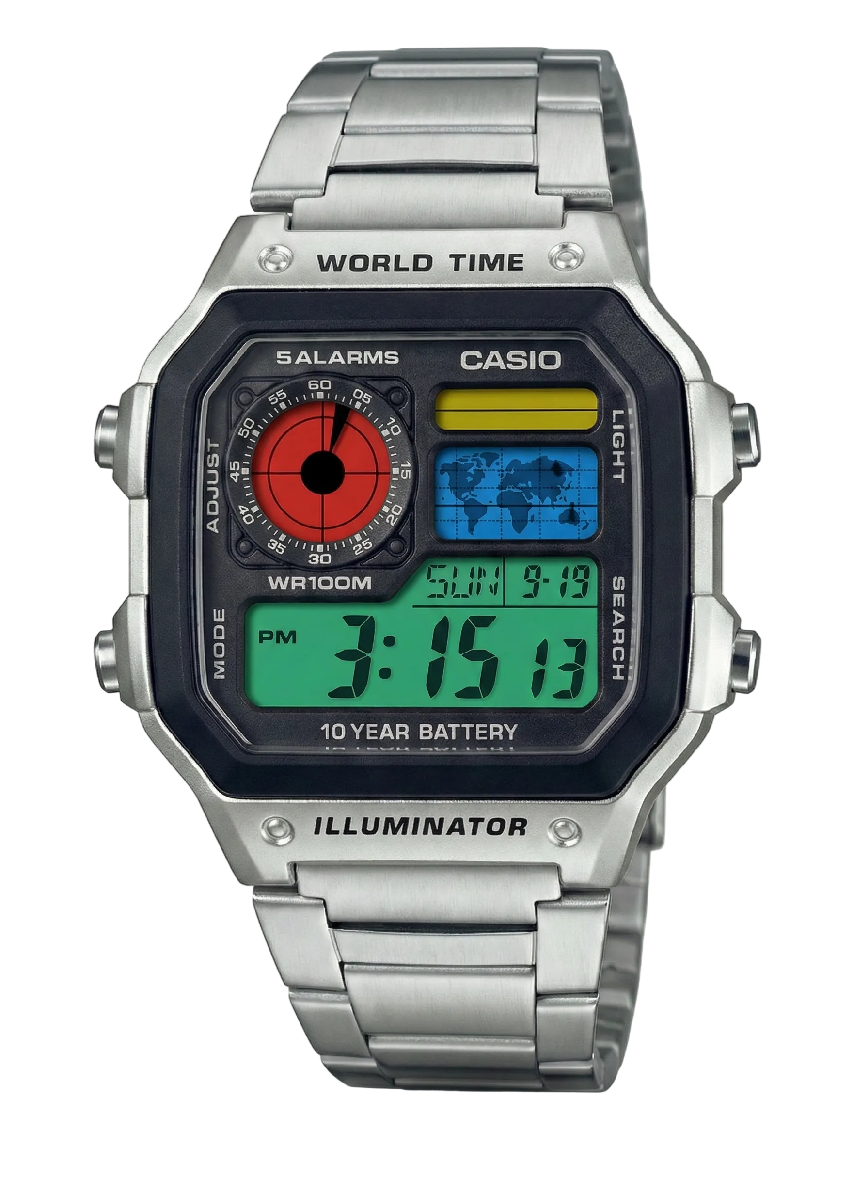 تعديل التوقيت:أدوات تحكم رقمية تعمل بالأزرار (الوضع، الضبط، الإضاءة)