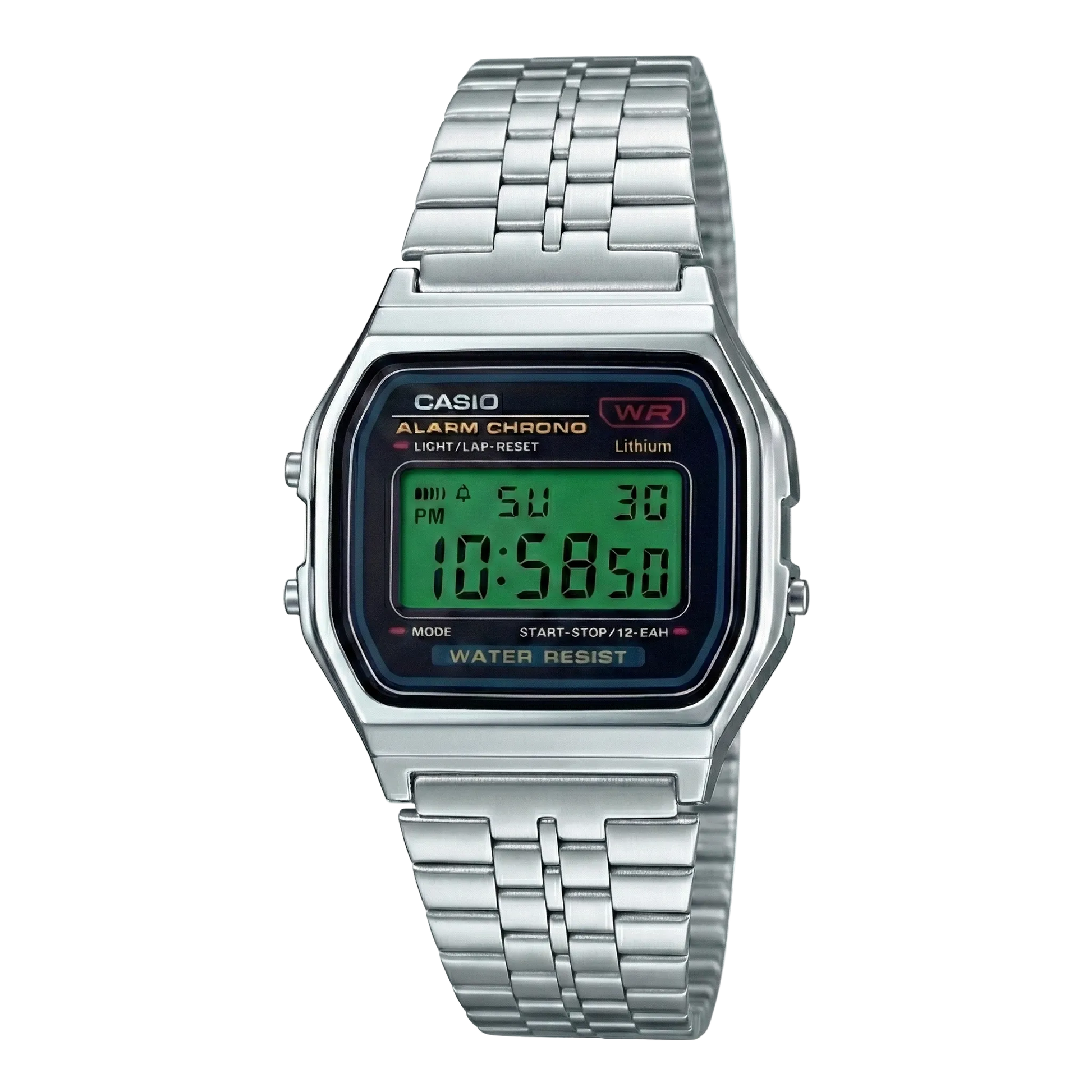 A159WA-N1DF is a classic Casio digital watch featuring a chrome-plated resin case and stainless steel bracelet, customized with a green dial mod that gives its iconic vintage design a bold, refreshed look. It runs on a reliable quartz movement with a clear digital display and includes essential everyday functions such as an alarm, stopwatch, and LED backlight, making it a unique and practical choice for daily wear, casual styling, and retro-inspired outfits.
